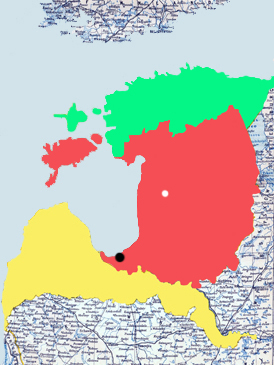 Die direkten Vorfahren Conrad v.Vietinghoffs hingegen waren durchgehend im Baltikum ansässig, dessen Festland in die historischen Landschaften Kurland (gelb), Livland (rot) und Estland (grün) eingeteilt war. Die Ahnen Conrads lebten in Livland (lettisch: Vidzeme); das Elternhaus Schloss Salisburg liegt etwa 150 km nordöstlich der Hauptstadt Riga und etwa 80 km östlich der Küste des Rigaischen Meerbusens entfernt.Bei der Gründung der Republiken Lettland und Estland (1918/1920) verschwand der Name von der Landkarte, denn Livland (rot) wurde geteilt. Dessen nördliches Drittel einschließlich der Insel Ösel (rot, heute Saaremaa) bilden zusammen mit dem ehemaligen russischen Gouvernement Estland (grün) das heutige freie Estland. Die südlichen 2/3 Livlands (rot) plus die ehemalige Region Kurland (gelb) bilden das heutige Lettland. Der schwarze Punkt zeigt die lettische Hauptstadt Riga, der weiße die ungefähre Lage von Salisburg (Mazsalaca) im Nordwesten Lettlands. Die baltischen Vietinghoffs folgten der Reformation, während der niederrheinische, nicht ausgewanderte Stamm mit Namen v.Vittinghoff genannt Schell zu Schellenberg katholisch blieb. Stammsitz war Schloss Schellenberg (Essen-Rellinghausen). Dieser Stamm ist in der männlichen Linie erst 1993 erloschen. |