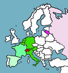 Er fühlt sich zu Recht als Europäer:Seine Vorfahren sind Deutsche, Belgier und Holländer. Er lebt in Frankreich, Deutschland, Italien, Spanien und in der Schweiz und spricht die Sprachen dieser Länder fließend – nebst etwas Englisch und Flämisch. Mit 19 Jahren erhält er die Schweizer Nationalität, da er bei Geburt russischer Untertan und nach dem Kollaps des Zarenreichs quasi heimatlos ist. Und er heiratet vier Frauen aus vier europäischen Ländern! So kommuniziert er selbst mit seinen Eltern, Frauen, Kindern und Enkeln in vier verschiedenen Sprachen. (Die auf der Karte markierten Länder sind die mehr oder weniger schicksalhaften in Egons Leben: Lettland, Russland, Belgien, Niederlande, Deutschland, Schweiz, Österreich, Italien, Frankreich und Spanien. Zusätzlich: Argentinien und Uruguay. Pink: sein Ursprung väterlicherseits; rot seine fast lebenslange Staatsbürgerschaft und der Ort seines überwiegenden Schaffens.) |