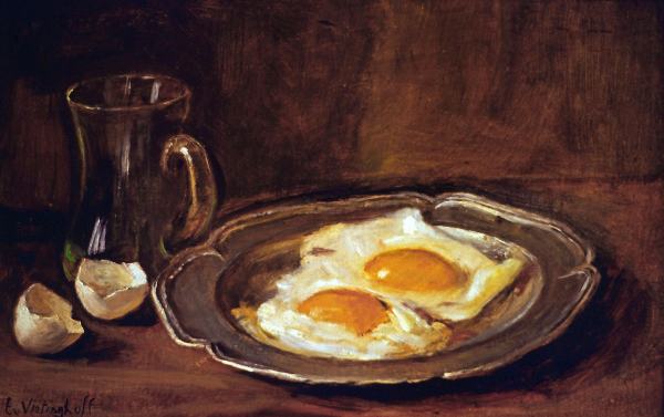 Spiegeleier auf Zinnteller mit Bierglas [1988]