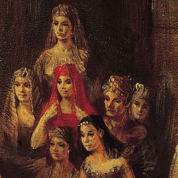 | Auf einem naturalistischen Werk wären alle aus nächster Nähe erkennbaren Schmuckstücke, Stickereien, Gewandfalten, Gesichtszüge, Frisuren, Teppichmuster, Unregelmäßigkeiten der Steinquader gleichwertig ausgeführt. Wenn jedes Detail auf gleich intensive Weise hervorgehoben wird, entsteht ein deskriptives Nebeneinander von Kleinigkeiten, in deren Überangebot sich das Auge des Betrachters nicht mehr auf ersten Blick zurecht findet. |